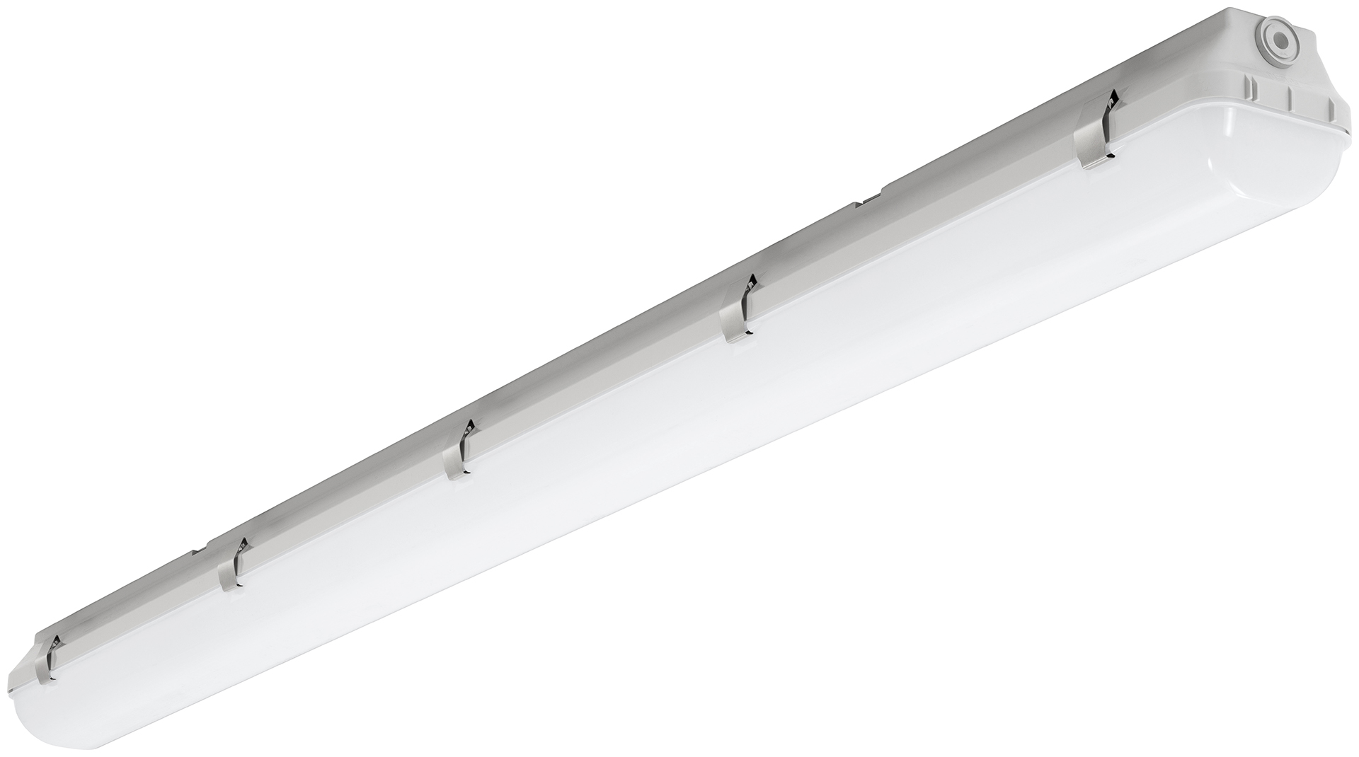 LED Feuchtraumwannenleuchte. Gehäuse aus hochschlagfestem Polycarbonat (PC), hellgrau. Alterungsbeständige, geschäumte PU-Dichtung. LED-Optiksystem auf weißem Geräteträger montiert. Opale Wanne aus UV-stabilisiertem Polycarbonat (PC) mit innenliegenden Längsprismen. Hochwertige Verschlüsse aus Edelstahl. Anschlussklemme in Steckkontakttechnik. Halogenfreie Verdrahtung. Geeignet für die Montage an Wand, Decke, Tragschiene (TRA) oder gependelt. Einfache Befestigung mit multifunktionalen Schnellmontage-Befestigungsklammern aus Edelstahl. Zugelassen für den Einsatz in Innenbereichen oder überdachten Außenbereichen. Die LED-Module sind durch eine autorisierte Fachkraft austauschbar.