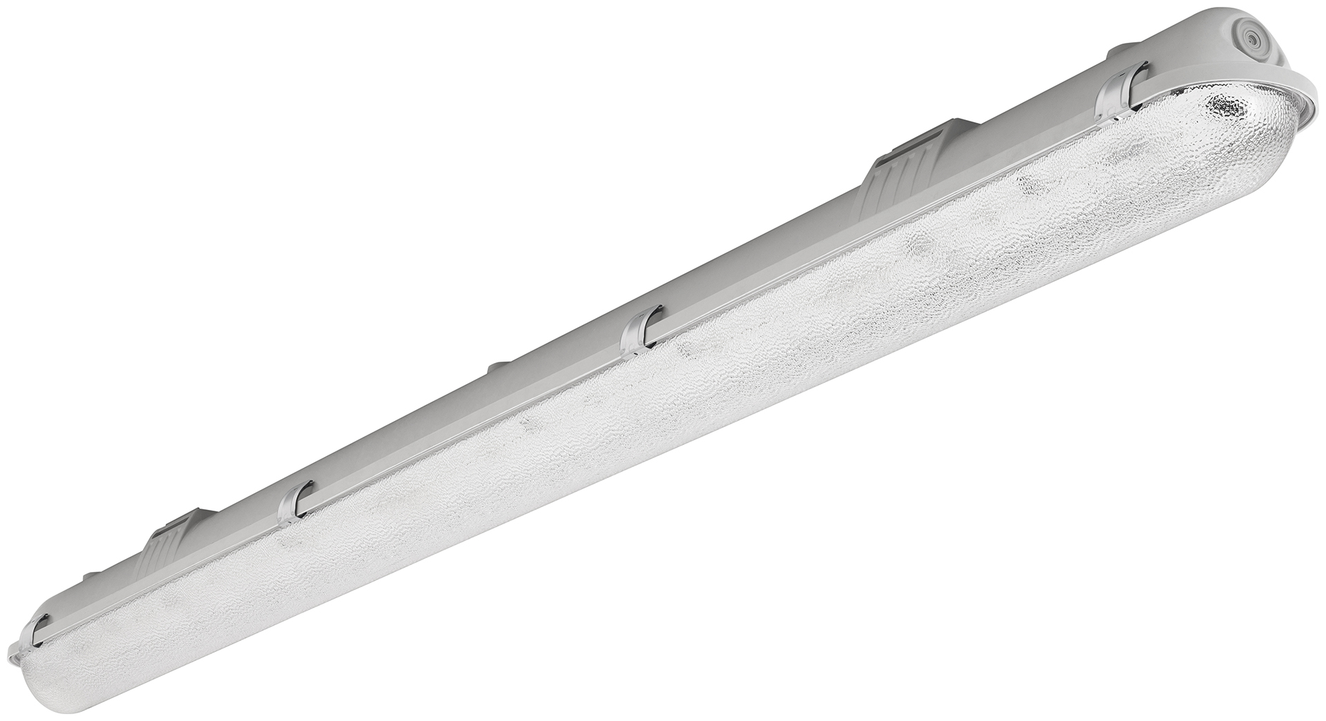 Feuchtraumwannenleuchte für LED-Röhre. Kurzschlussschutz dank eingebauter Feinsicherung. Leuchtenunterteil aus glasfaserverstärktem Polyester, hellgrau, schwer entflammbar. Wanne aus UV-beständigem Polymethylmethacrylat (PMMA), geperlt. Wannenverschluss aus Edelstahl. Multifunktionale Schnellmontage mit Befestigungsklammer aus Edelstahl (Leuchte einklipsbar). Ausrichten der Leuchte durch den variablen Verschiebebereich um 60 mm.