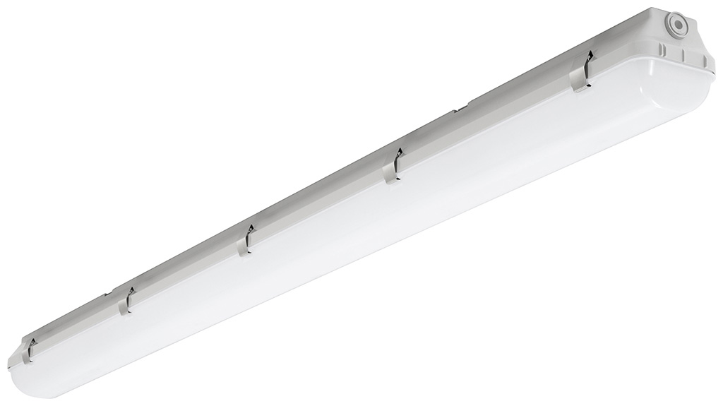 Gehäuse aus Polycarbonat (RAL 7035) schwer entflammbar, Wanne aus opalem Polycarbonat mit innenliegenden Längsprismen, Profildichtung EPDM, Gehäuse mit Edelstahlklammer für Deckenbefestigung, Edelstahlverschluss, HACCP zertifiziert.